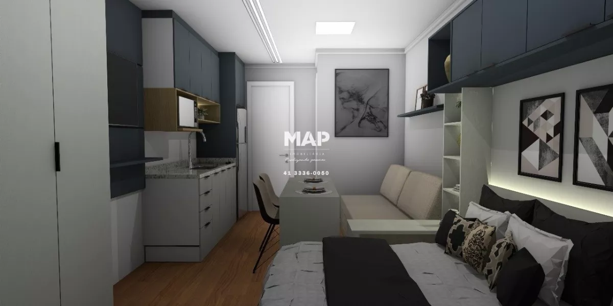 Excelente Studio! Entregue mobiliado conforme projeto. Móveis Planejados. Privacidade acústica com isolamento eficiente entre os apartamentos. Dispositivos economizadores de água com mediçâo individual e retenção de águas pluviais. No bairro Agua verde, fica a 450 metros do MUFFATO, 550 metros do Shopping Palladium